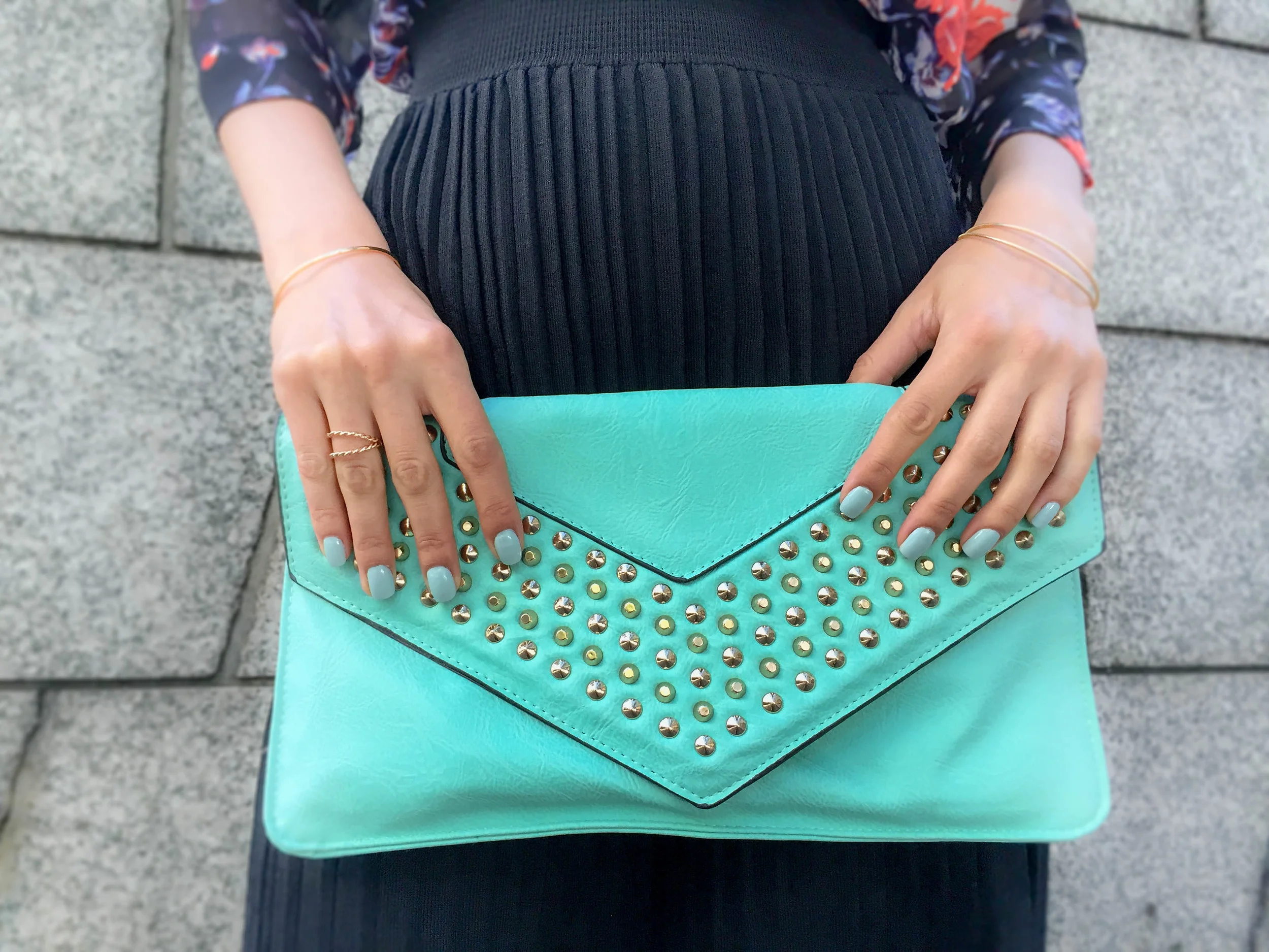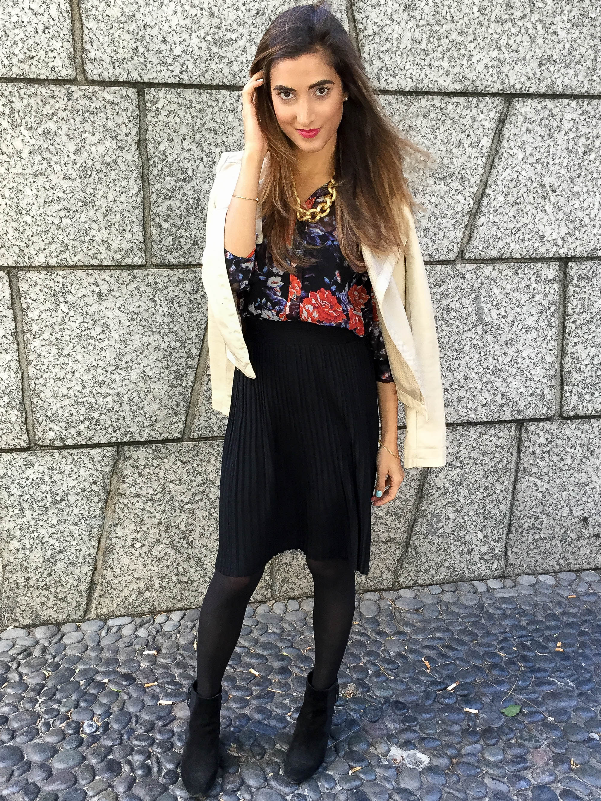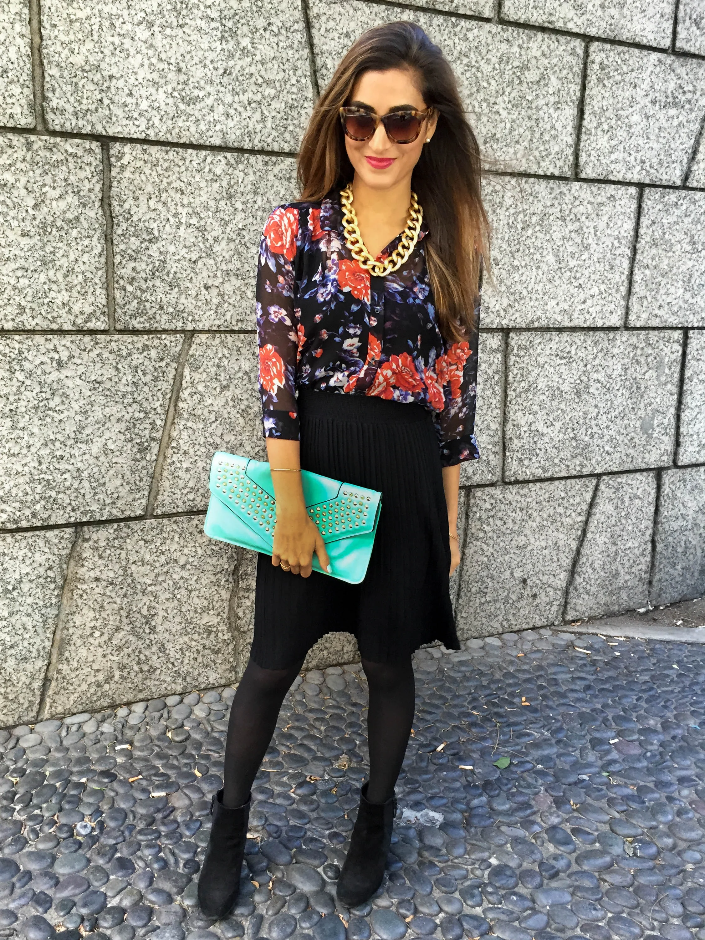 Blouse: Wilfred (similar options here); Skirt: Forever 21; Clutch: Vintage; Sunglasses: Anthropologie (similar options here); Necklace: Fornash; Shoes: Via Spiga Abri wedge bootie; Nails: Formula X for Sephora in Unmistakeable