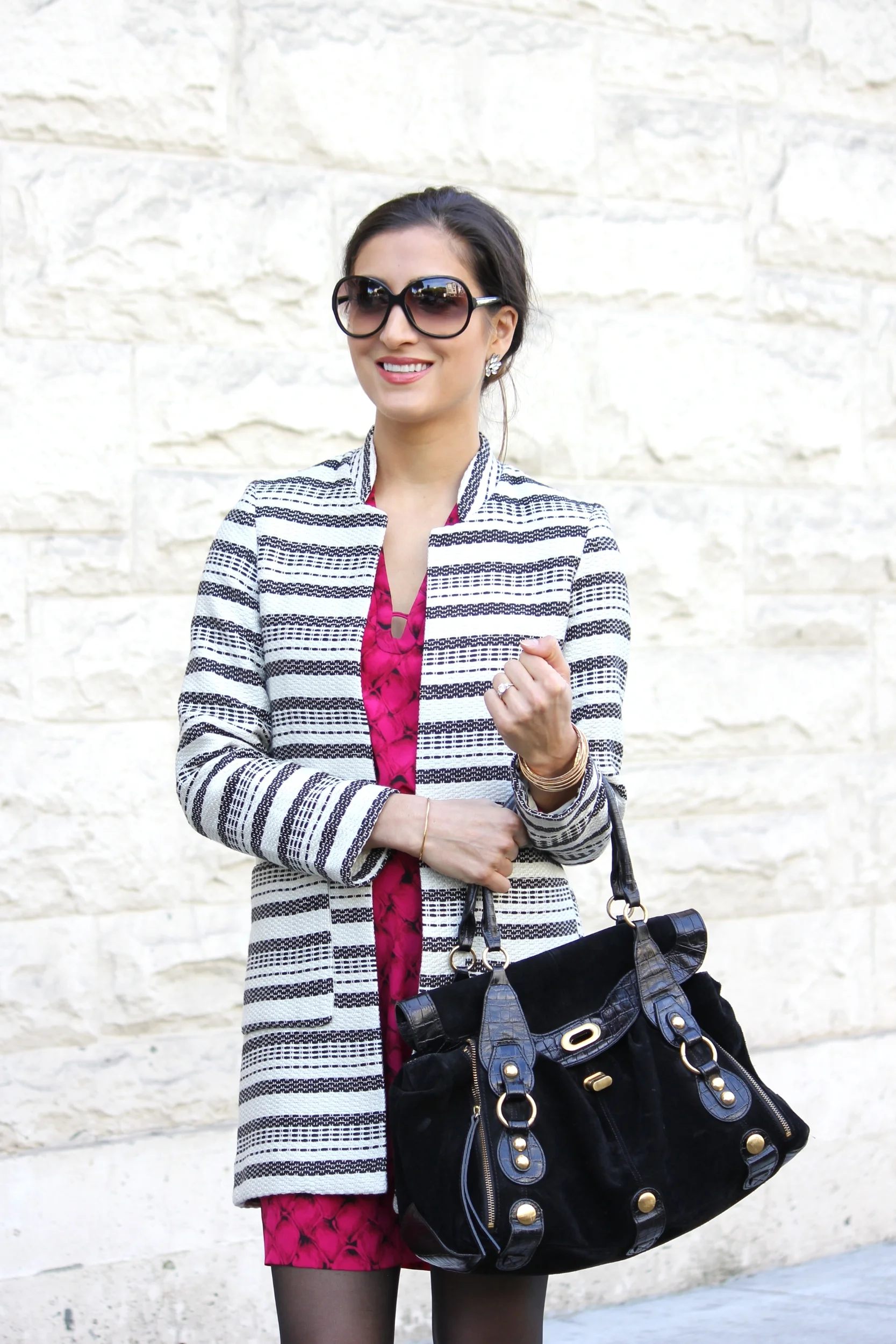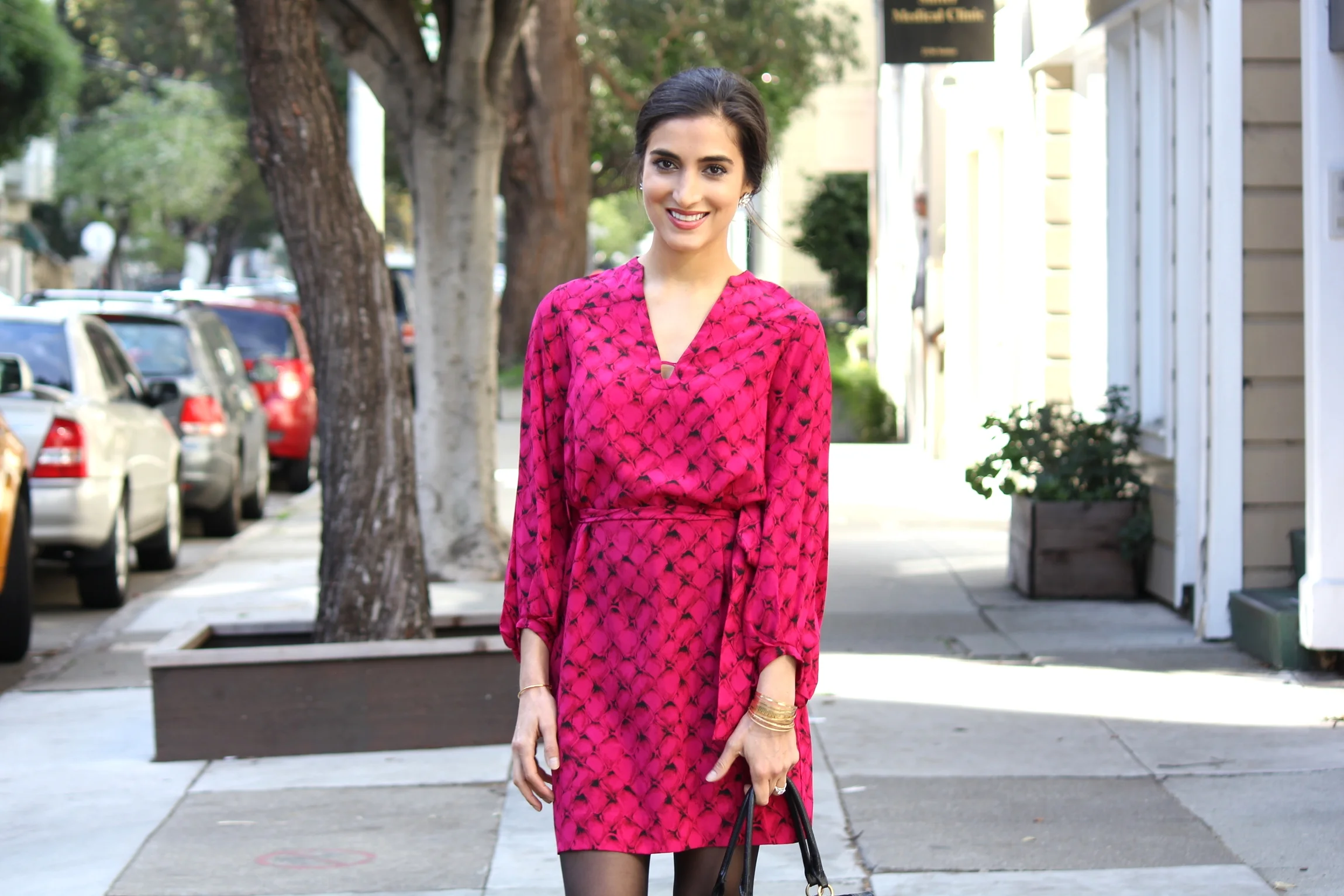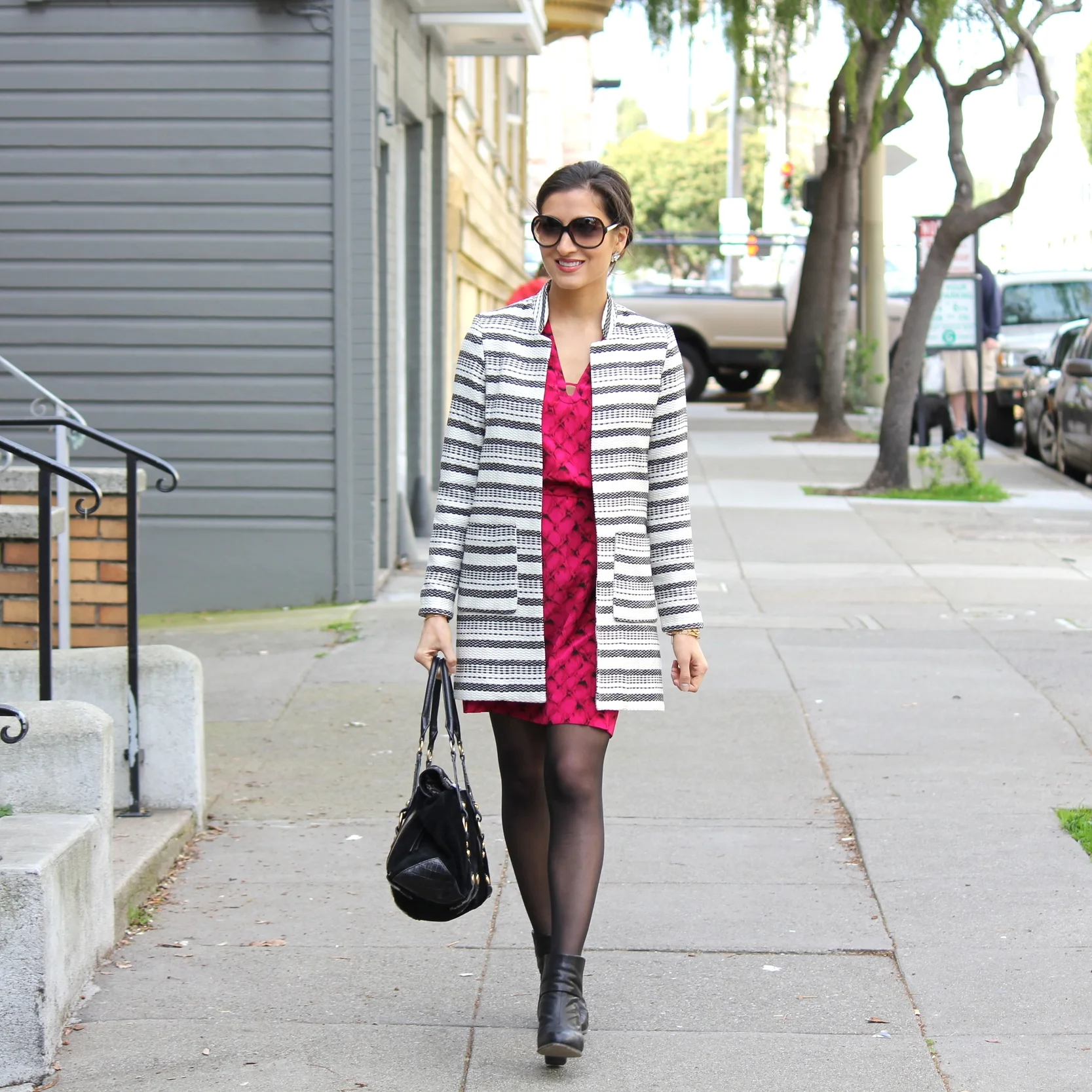 Enter this dress. I was at my local Last Call Neiman Marcus shopping for an event when my keen intuition kicked in and I spotted this dress on the rack. It was mere moments from rack to fitting room to purchase, adrenaline pumping all the while.  I ended up wearing something else to the event, but decided to keep this dress and figure out how I could layer it so I could wear it to work (it needs tights for work too; don't worry, I'm aware of the high hemline). I think it looks far cuter with a white shirt underneath than it did without. Voila!